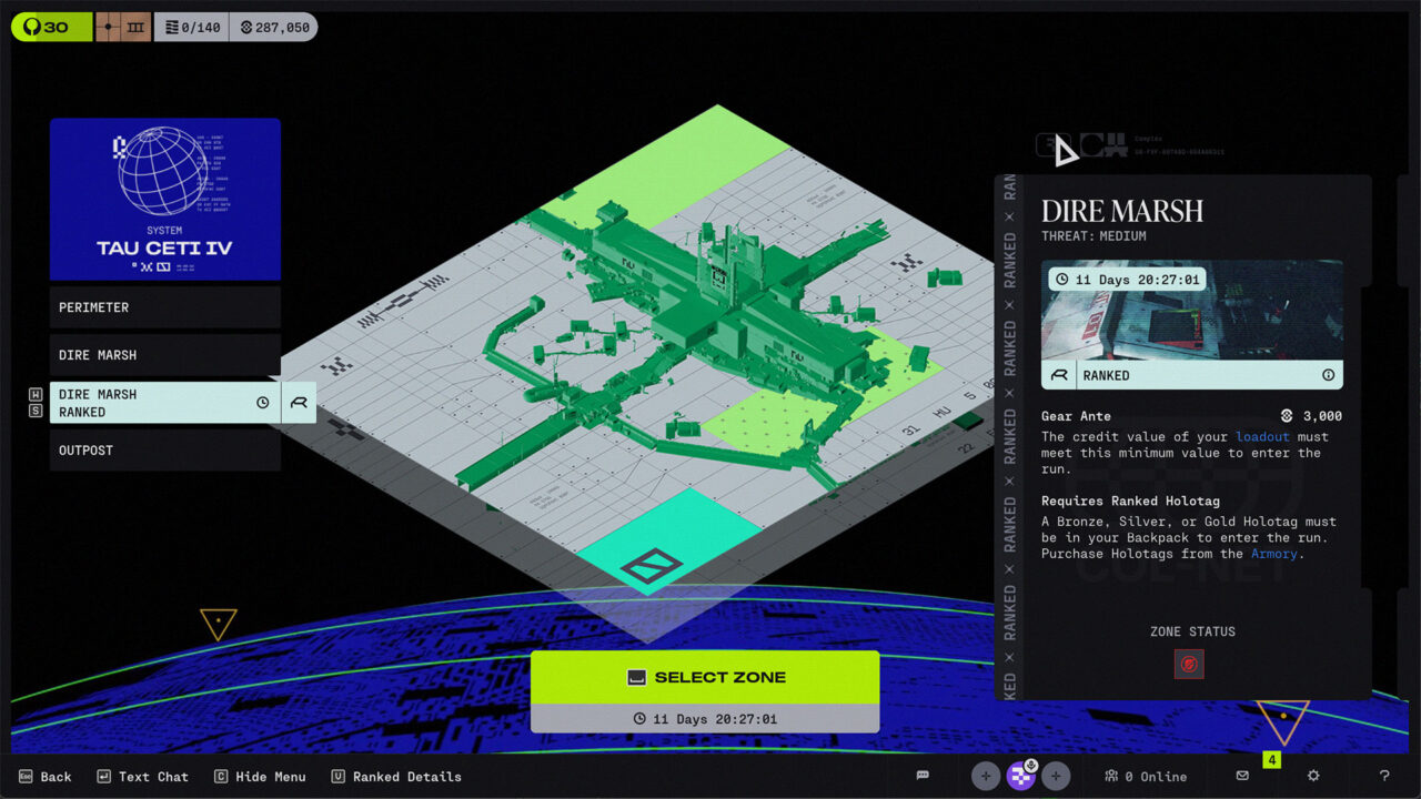 In addition to the Holotag requirement, Ranked matches have a gear ante, which is the minimum credit value of your equipped loadout. For Low Stakes, that’s 3,000 credits, roughly a set of Enhanced gear with a few Deluxe pieces. For High Stakes, it’s 10,000, about a full Deluxe set with some Superior items. The ante ensures everyone in the match has something on the line, so no more naked knife runs or Sponsored Kit cheese.