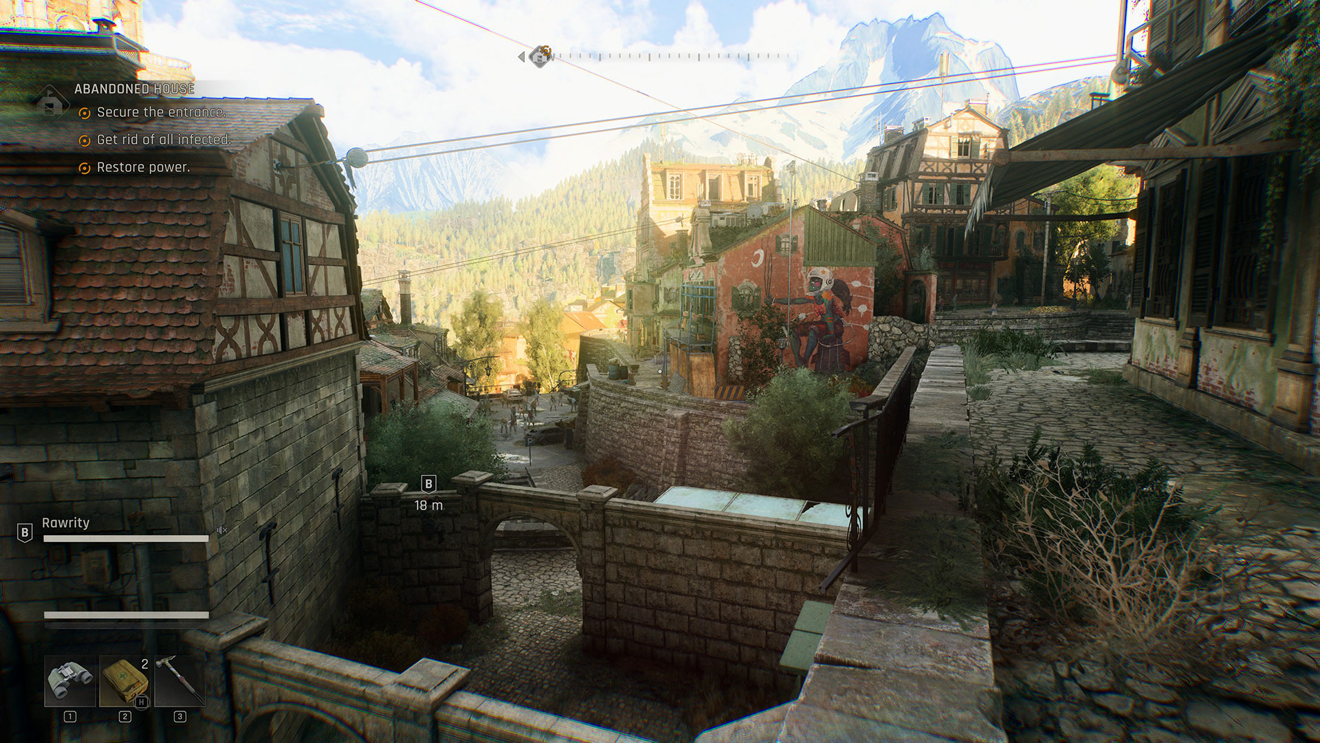 All that shimmying is a sharp contrast to normal traversal in this wonderfully crafted world that serves as a playground. While it’s not quite as fun as Marvel’s Spider-Man 2, hopping from rooftop to rooftop to avoid Volatiles at night brings back fond memories of the first Dying Light. This time around, though, it feels even more intense and suspenseful, given how some areas in Castor Woods can feel a bit claustrophobic. Speaking of Castor Woods, it may not be as large a world to explore as in the previous two games, but it’s well-designed with a mix of environments. Throughout the adventure, Crane will find himself exploring idyllic townscapes, industrial complexes, dark underground caves, and sprawling forests. Once again, there’s no fast travel available, but vehicles are scattered throughout the land to make traveling long distances easier.