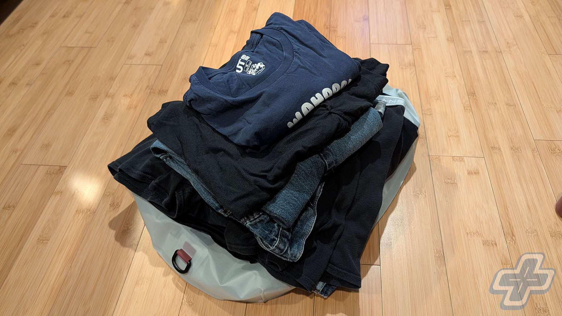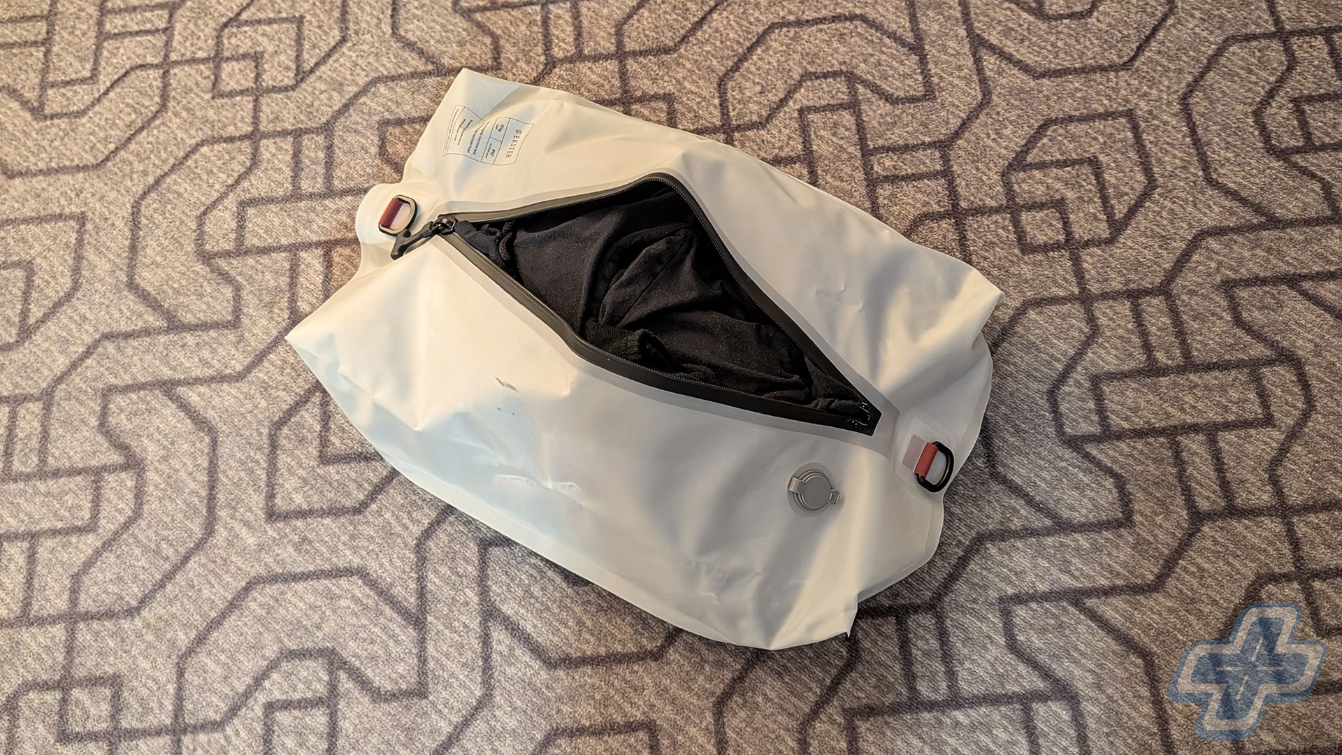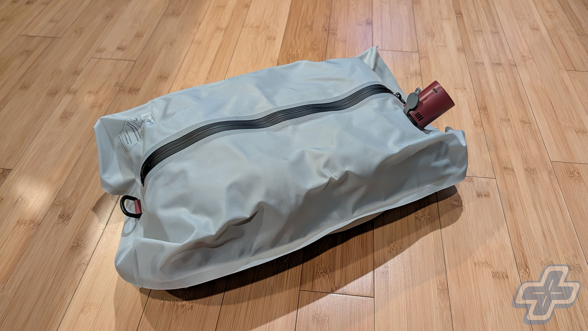 As for the bag itself, it features anti-rip, waterproof nylon and an air-tight zipper. It’s extremely well-made and feels high quality, and I don’t have any concerns that it may accidentally rip or tear. It also did a good job of keeping my clothes wrinkle-free while sealed. My biggest criticism of the entire kit is that I really wish the pump had an additional power switch to prevent it from accidentally turning on. The button you see up top is what activates the pump, and I found it to be a little bit sensitive. While stored away in my backpack, something pushed up against the button and turned it on, causing me to wonder what weird noise was coming from my bag. One of those small side-to-side switches on the underside would have been nice to have to prevent that from happening.