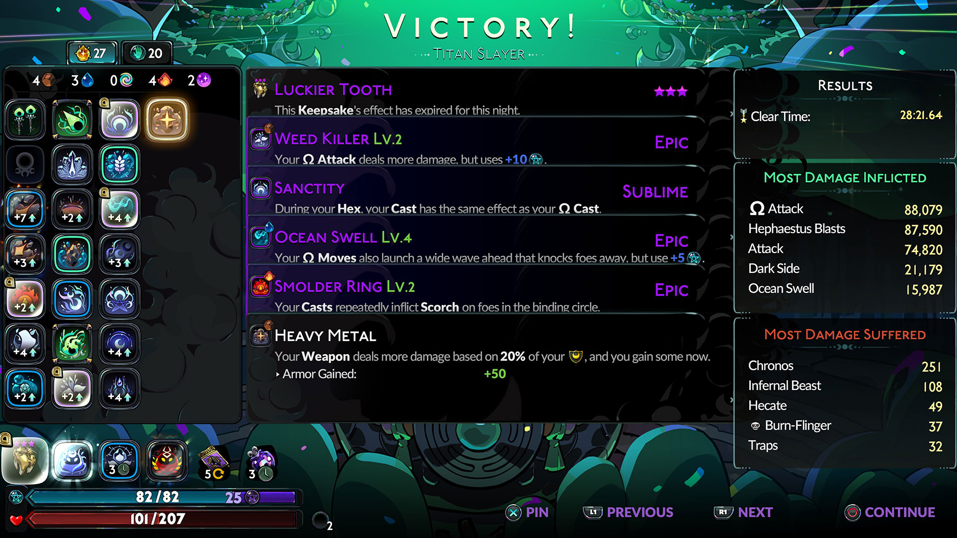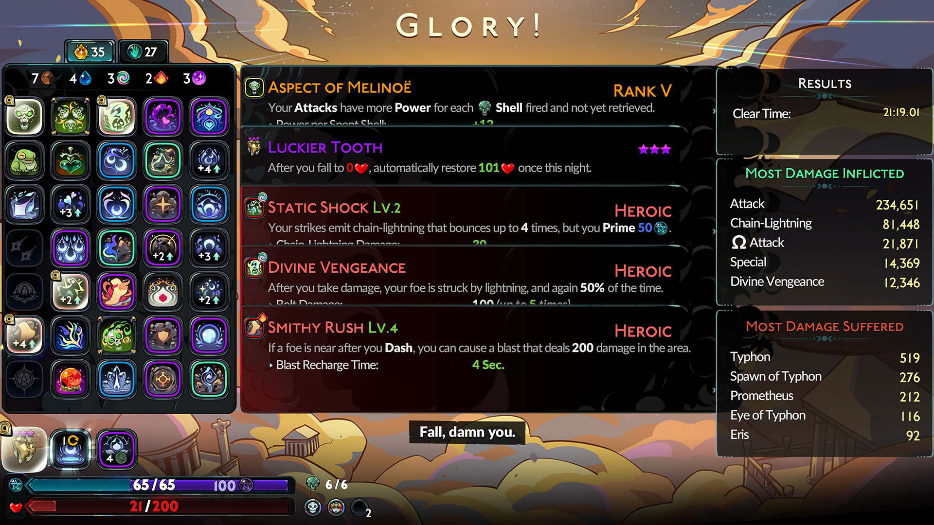 At a certain point, the game will show you the materials that are needed in order to complete it. After the recent patch, which added more story elements to help address common complaints with the game’s ending, the requirements are now eight total clears of the bottom path, and five total clears of the upper path. Considering how much post-game content there is, including an entire epilogue, I really don’t understand why Supergiant Games gated the ending of the game behind so many clears. I get it. One could argue that’s the whole point of the game, that you’re simply playing it and eventually you’ll get to the end. But instead of feeling like having a carrot dangled on a stick in front of me, I found myself thinking “ugh, I have to do this again.“