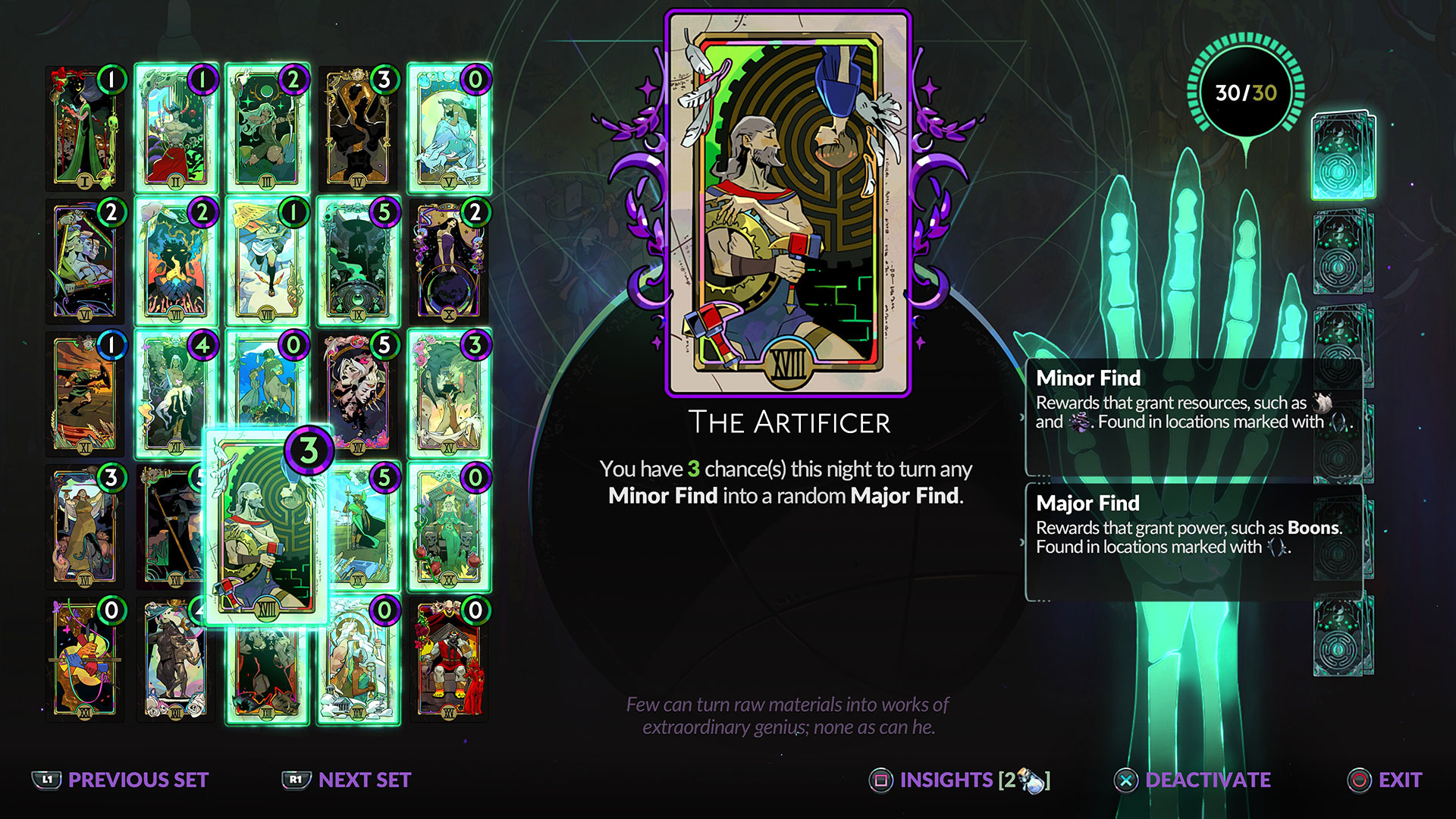Meta progression comes in the form of Arcana Cards, which have a budgeting system and require resources gathered during runs as well as from killing bosses to unlock. Other permanent upgrades come from Incantations, some of which make subsequent runs a bit easier by adding a healing spot in certain areas, for example. You also get access to keepsakes, which are granted by gifting the various gods throughout the world. These keepsakes vary in effect, and eventually you unlock the ability to swap them out between levels. Later on, the game gives you ways to further enhance weapons and bring along a familiar, which is like a pet.