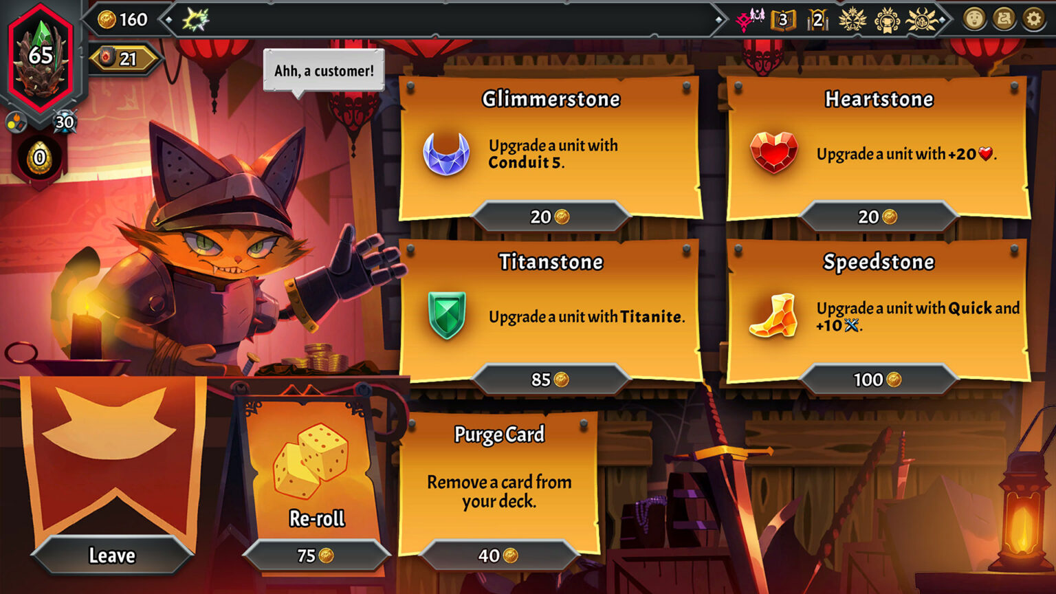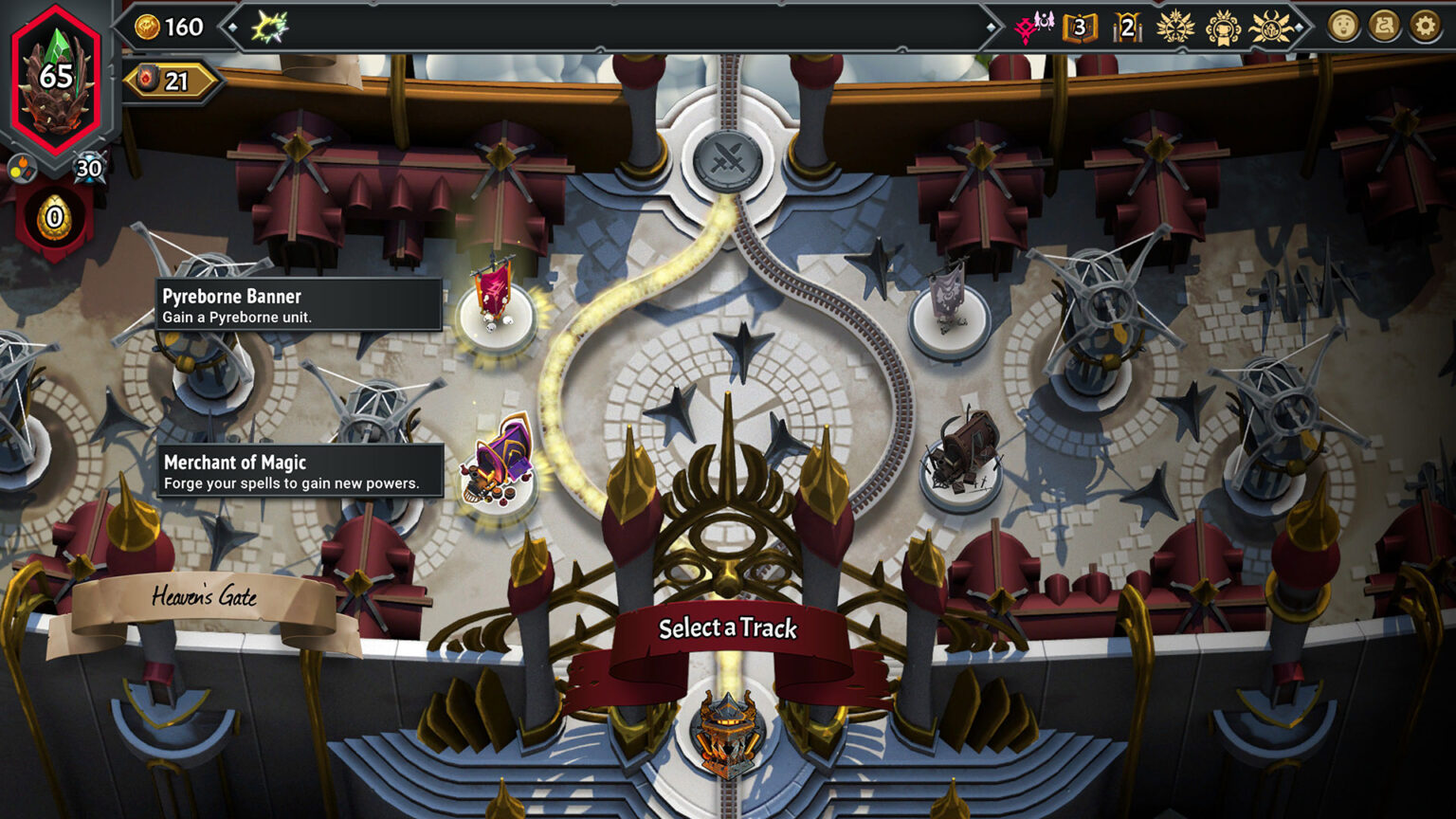 Following successful battles, players choose between two paths, each offering different rewards. Multiple shops include places to upgrade units or spells, or acquire artifacts, weapons, and room cards. Of course, these shops require currency which can be gained throughout your run. Prior to some battles, there’s also an option to add a modifier to earn additional currency. Other nodes on the map include locations that allow you to remove up to two cards from your deck, replenish Pyre Heart health, duplicate a card, or earn gold. All of these variables contribute to the depth that Monster Train 2 has to offer and make each run feel different than the last.
