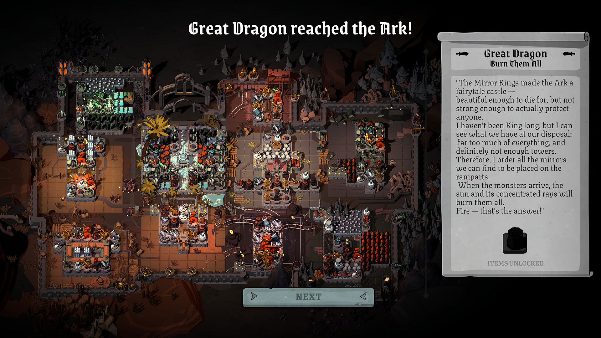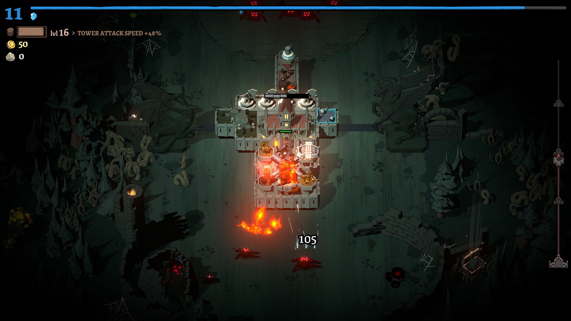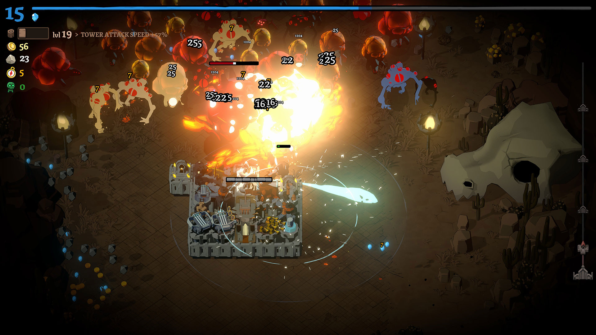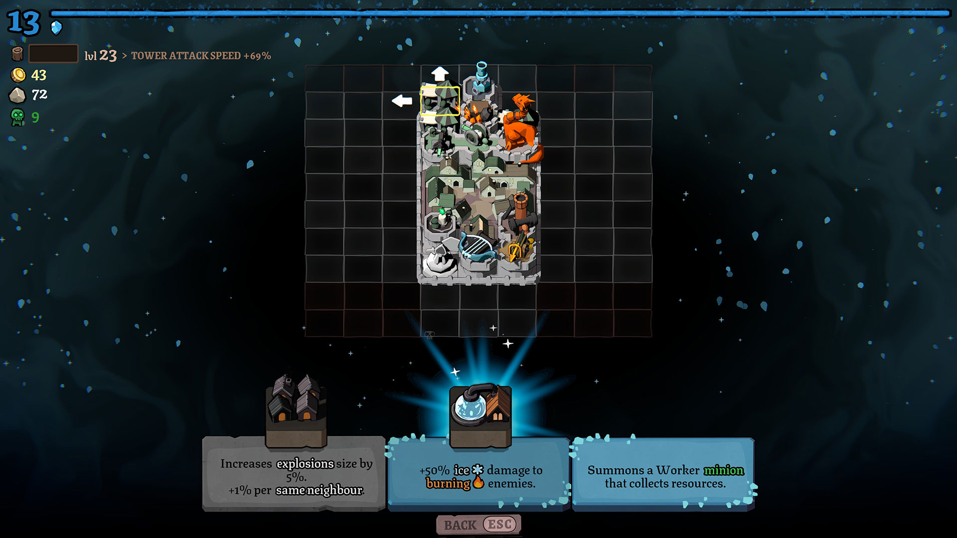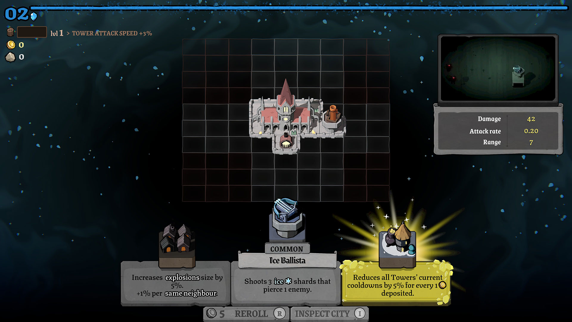 In terms of towers, there’s a wide variety of options, possibly too many. You have your pretty standard towers like fire and ice, along with several options for towers that spawn different types of minions. The more interesting buildings are the ones that produce currency and resources, while others serve as passive buffs to certain types of attacks. Connecting some of these buildings will strengthen their effect, essentially creating a neighborhood of sorts. There are some synergies that can result in builds that make you feel like you broke the game, but they’re really rare because of how many different options there are. Sometimes it’s really frustrating rerolling over and over, hoping to get what you need and never seeing it.