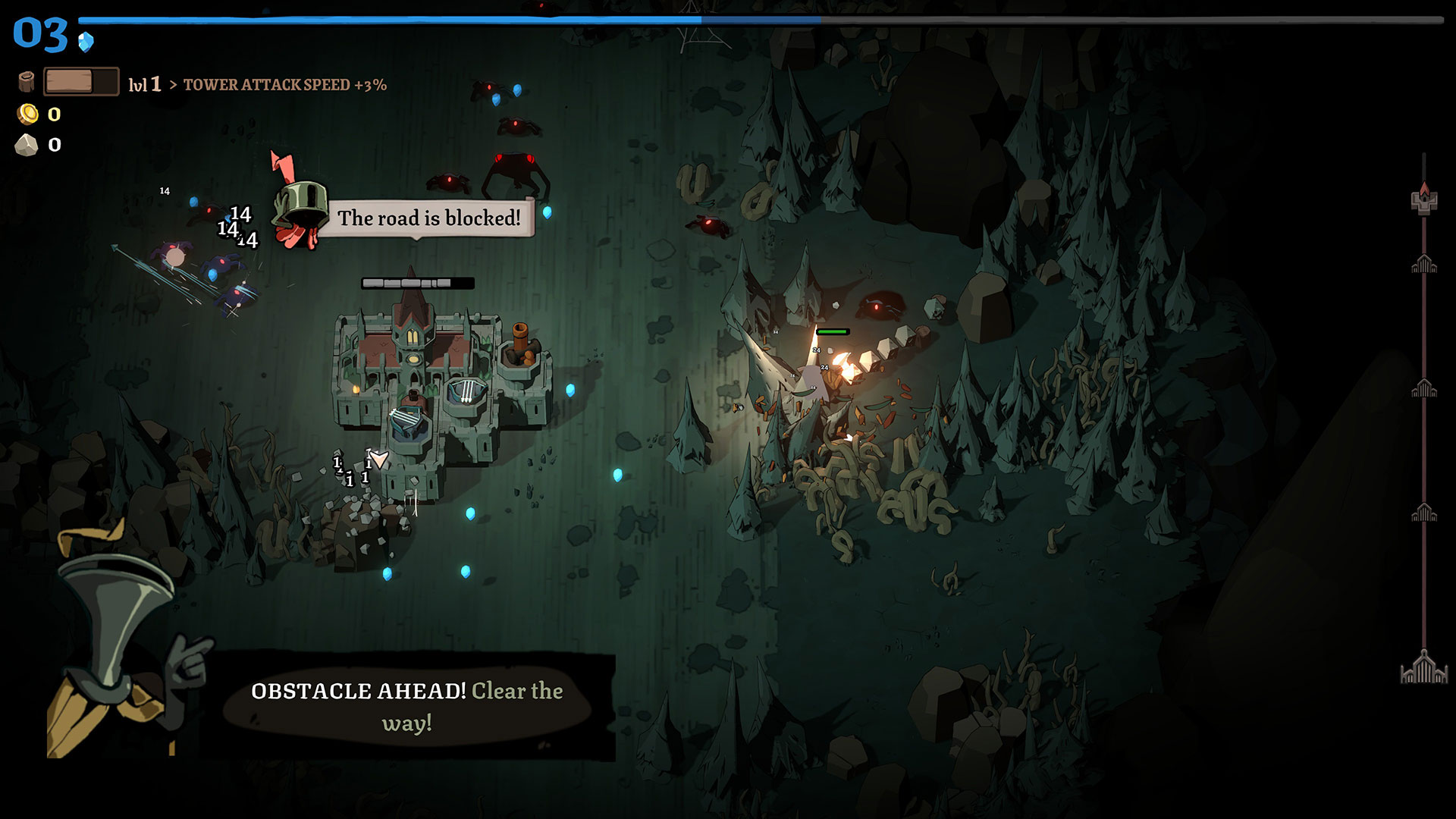 The core gameplay loop in Monsters are Coming! Rock & Road is pretty easy to understand if you’ve played any survivor-like game, especially Deep Rock Galactic: Survivor. In Monsters are Coming! Rock & Road, you control a hero who can equip up to four weapons, while the town hall where you place your towers moves on its own. Your hero automatically attacks and harvests when there are enemies, trees, or rocks nearby. The goal of the game is to gather up XP in order to level your town hall, wood to increase your towers’ attack speed, and stone to repair your town hall. Anything you collect on your hero must be deposited onto the town hall, so it’s a bit of running around, collecting things, and dropping them off. There’s a limited number of items you can bring back with your hero, resulting in this frantic back and forth style of gameplay.