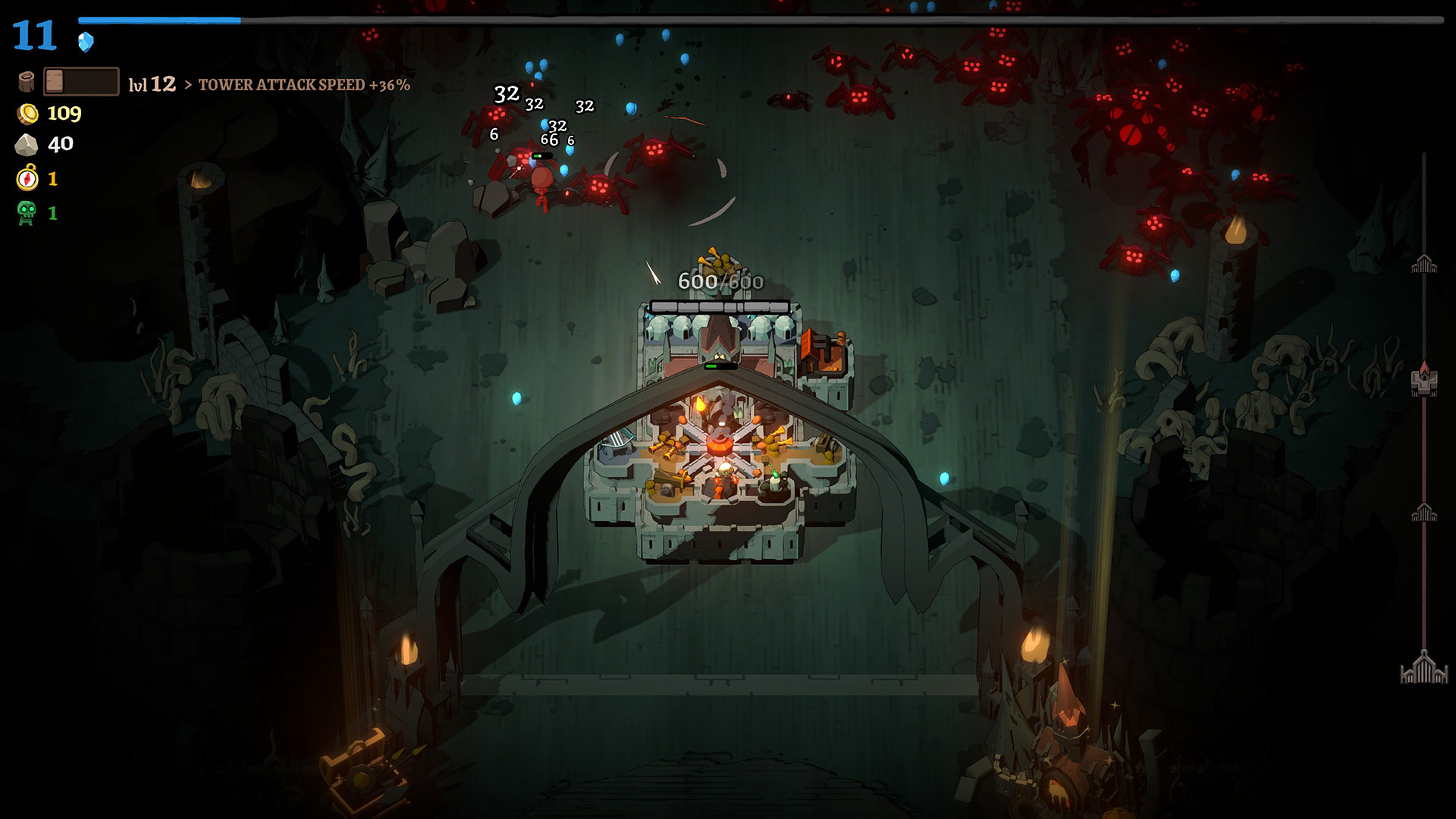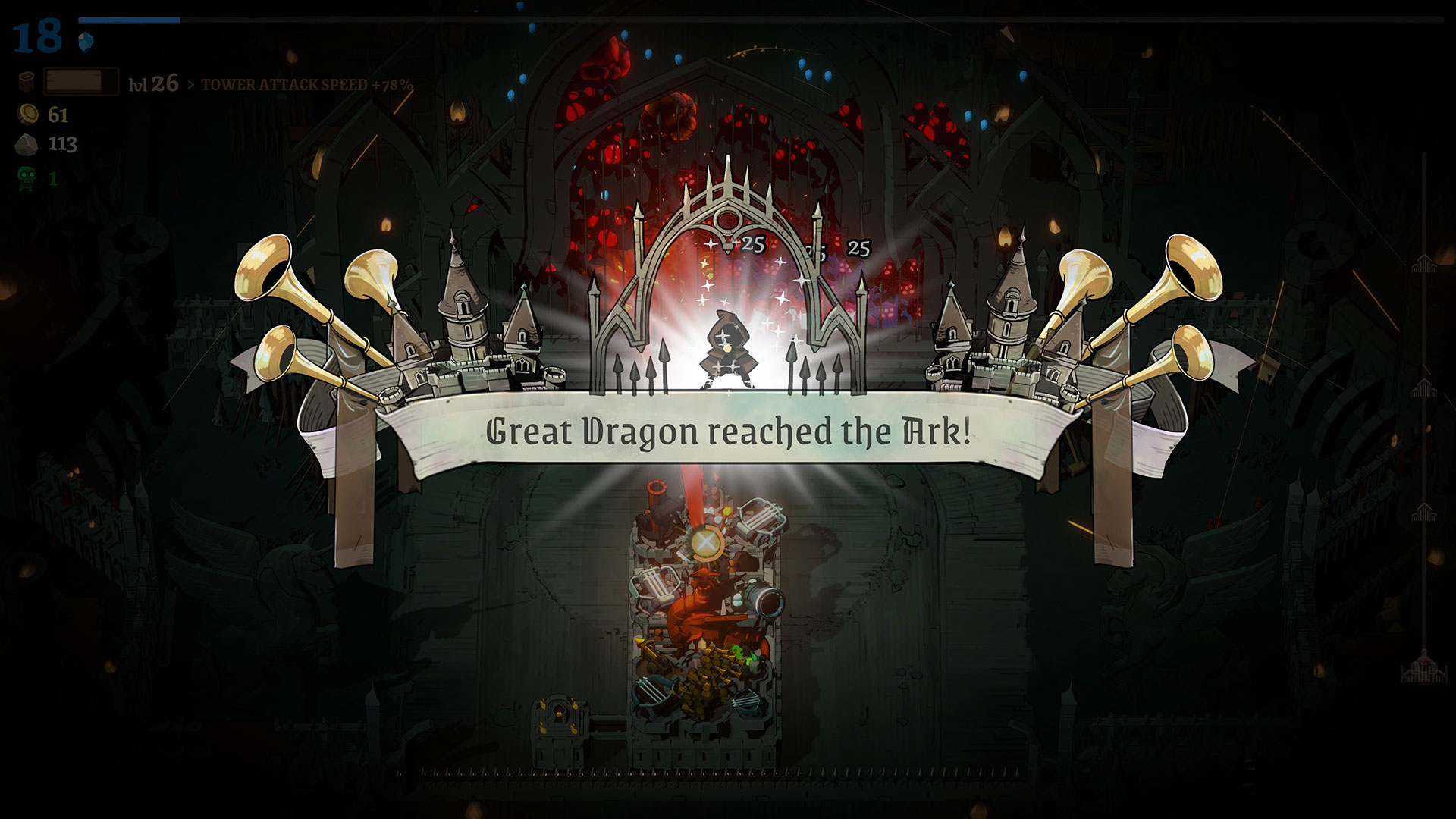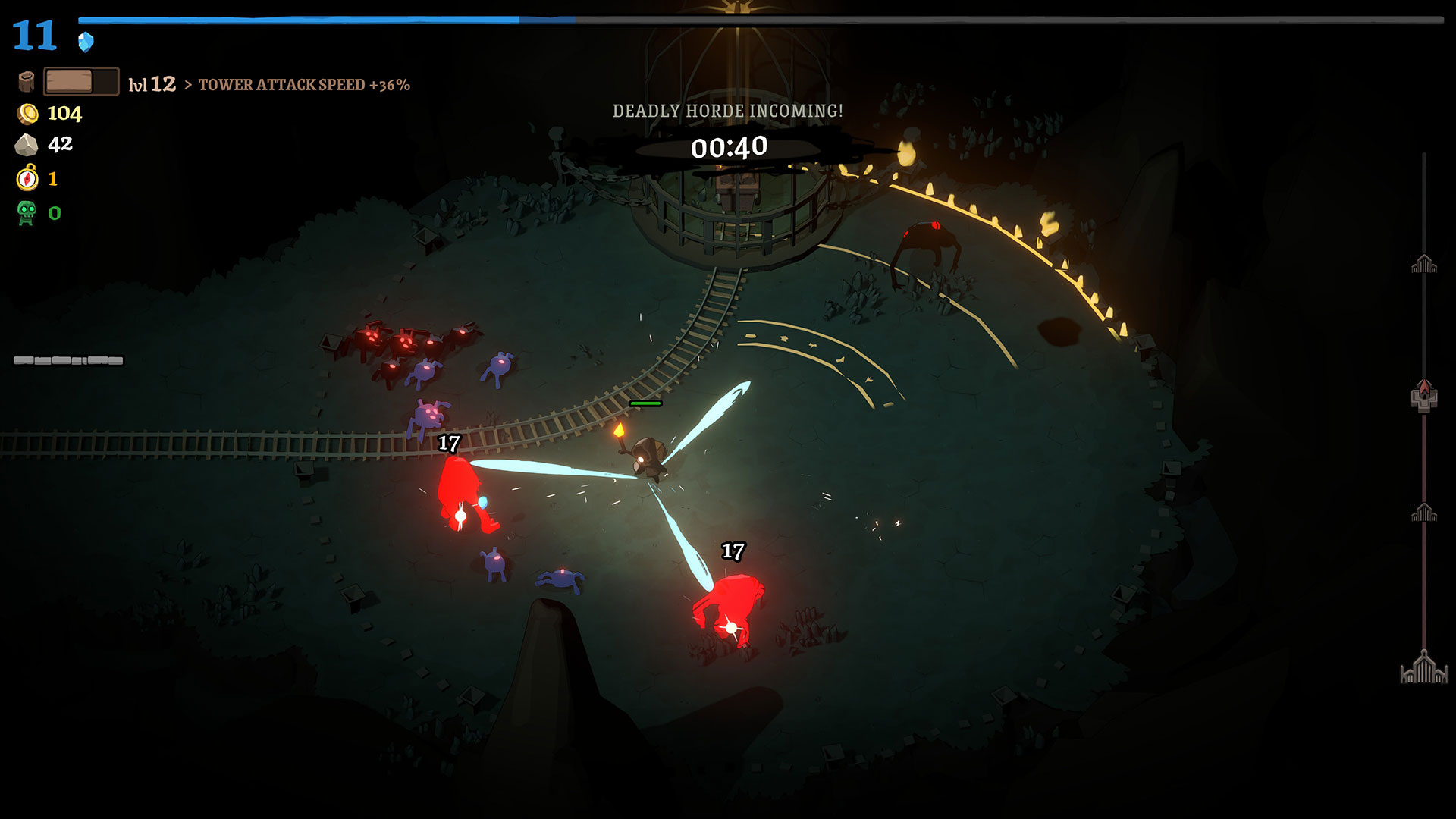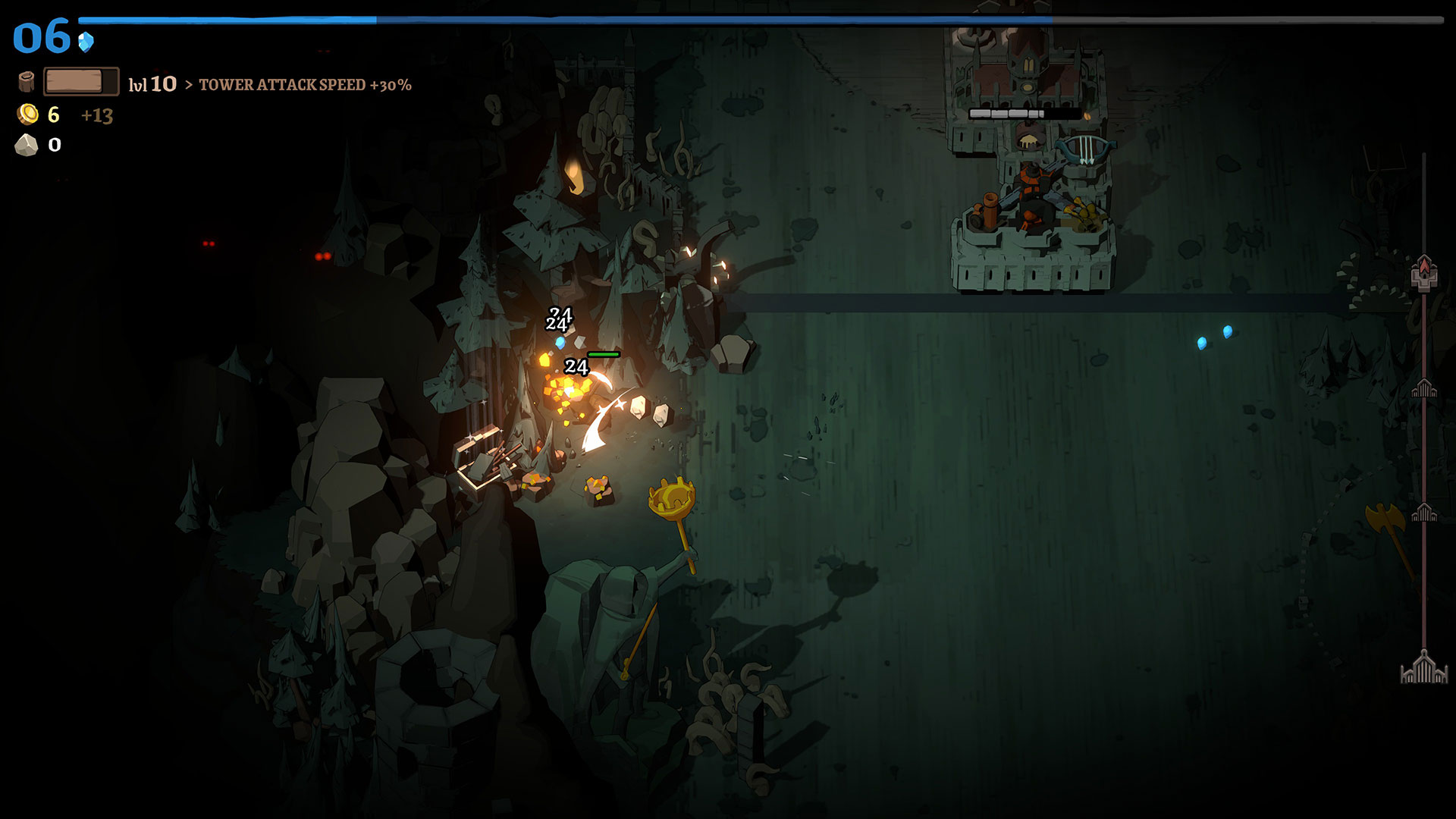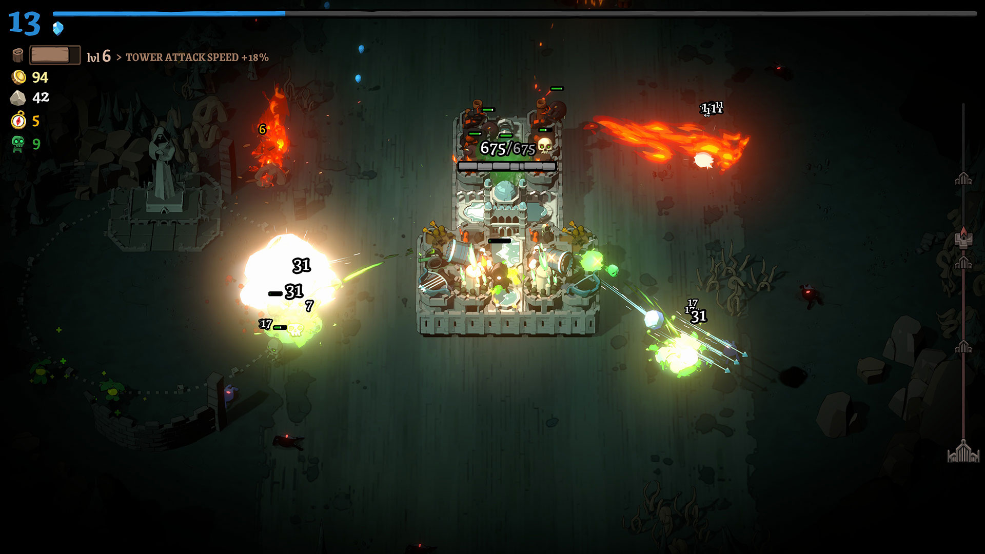 Once you get into a rhythm, you’ll find yourself spending time helping kill enemies that are near your town hall, while bringing back as much wood and stone as you can. Extra stone can be stockpiled to be used automatically for repairs whenever your town hall takes damage. Each time you level up your town hall, you’ll get an option to choose one new tower to add. Meanwhile, hero upgrades come in the form of chests, which can be found on the trail and at checkpoints on your run. The chests found on the trail offer an upgrade for one of your hero’s weapons, while the chests at each checkpoint unlock an additional weapon for the hero. Initially, these weapon upgrades are pretty basic, letting you choose from more attack, speed (cooldown reduction), and size. Later on, the game does add some more engaging and interactive weapons, such as a dagger that creates a minion on a kill, but their upgrades are never very complex.