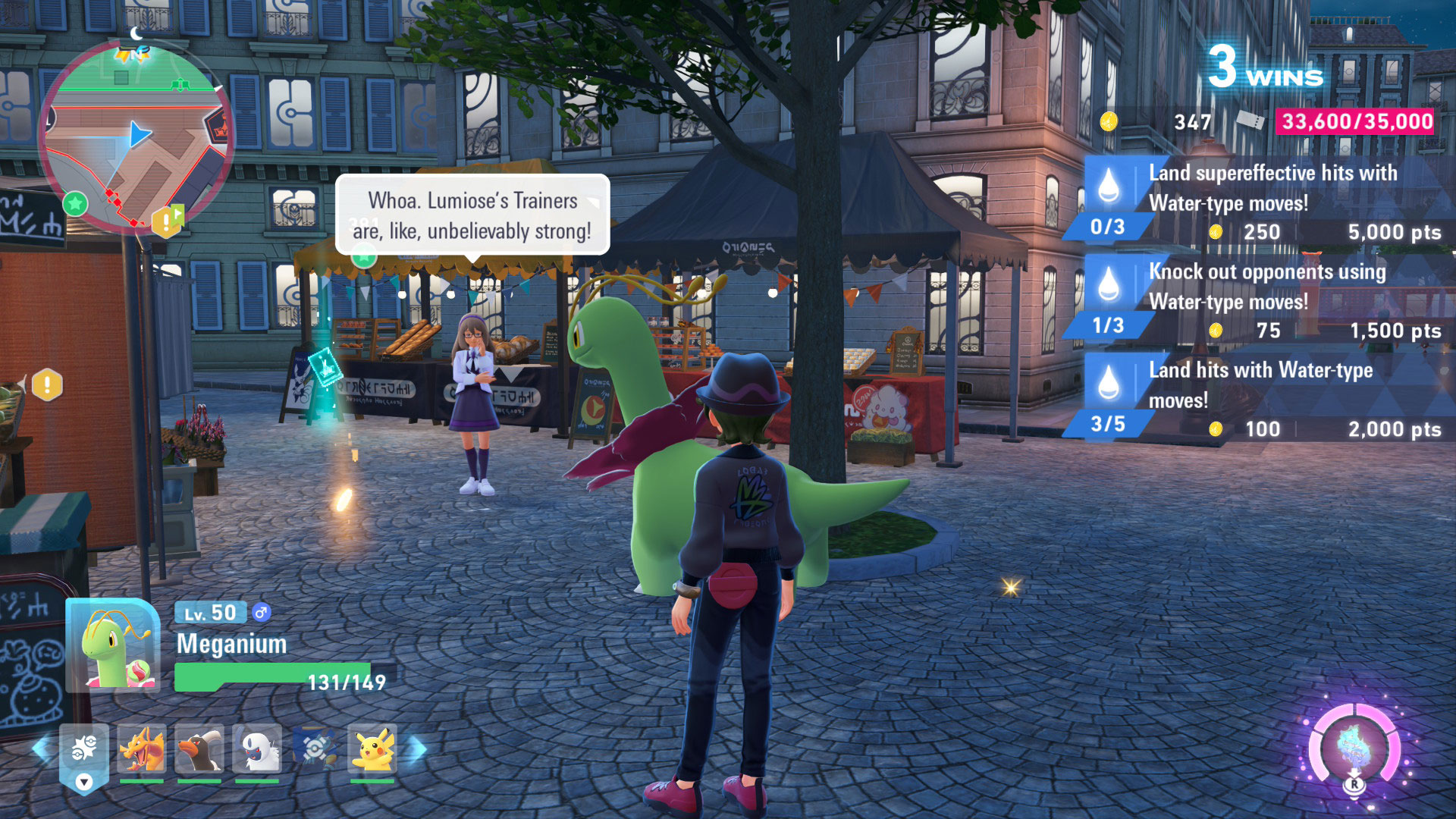Personally, I spent my daytime capturing all the Pokémon in each Wild Zone, which also resulted in some grinding for my team. You’re able to keep six equipped at any time, and you’ll find yourself swapping quite a bit until you get the team you’re happy with. During the evenings, I mainly ignored Battle Zones until I needed a Challenger Ticket for my main quest. The day-night cycle is interesting, but it can also be frustrating. When the cycle flips from day to night (or night to day), it completely interrupts what you’re doing. If you’re in the middle of a battle, you’ll lose all progress, and the fight will reset. Even your Pokémon go back into their balls. Granted, the game gives you ample warning before it happens, but it’s still frustrating if you aren’t paying attention to the notice. It would be simple to delay the cycle change until the player is out of combat.
